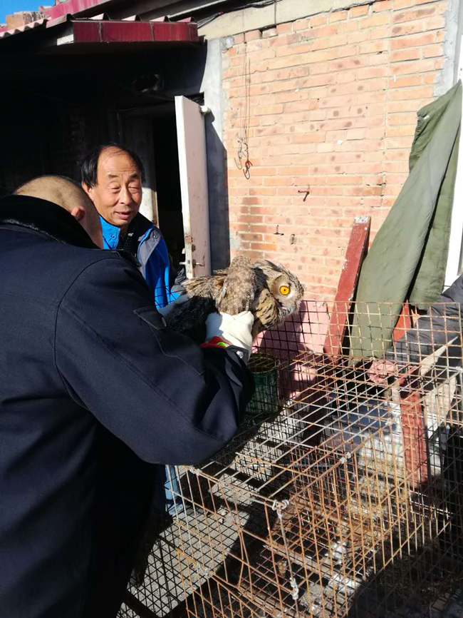 2017年11月28日上午11时18分,该局接到市森林公安局转警称:桥东区大仓盖镇定兴堡村一养殖户家中养殖棚内飞进一只鹰。接到报警后,该局刑侦治安大队民警立即前往该养殖户家中,发现为一只国家二级保护动物——猫头鹰。经现场查看,该猫头鹰无明显外伤,体态正常,精神状态良好,该局民警对该猫头鹰妥善处置,随后将移送至市野生动物保护中心进行进一步救治。